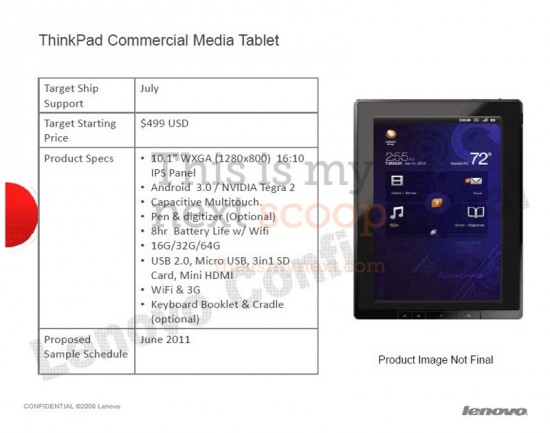 ကမ္ဘာ့ စတုတ္ထ အကြီးဆုံး PC ထုတ်လုပ်သူ ဖြစ်သည့် Lenovo မှ Android 3.0 အသုံးပြု ထားသည့် touch-screen tablet ကို ယခုနှစ် နွေရာသီ တွင် ထုတ်လုပ် ရောင်းချရန် စီစဉ် နေပြီး tablet ၏ အလေးချိန် မှာ ၁.၆ ပေါင်ရှိပြီး ၁၀.၁ လက်မ အရွယ် IPS (in-plane switching) touch screen နှင့် Nvidia Tegra 2 ပရိုဆက်ဆာ တစ်ခု ပါဝင် ကြောင်း သိရသည်။